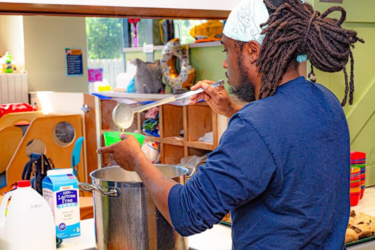 Jomo Upton, Chef at the Edison YWCA, serves up potato soup on the side with turkey and cheese wraps with local spinach and tomatoes.