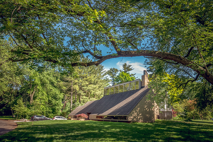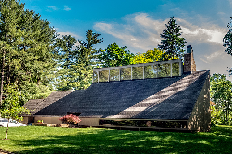 This mid-20th-century house (designed by an architect who lived in it), which I dubbed The Mothership years ago, caught my eye because at first glance, it’s all roof and no house – but the windows along the top and bottom ultimately give it a spaceship vibe. When you view the house from the side, and see that the back forms a slanted triangle facing the opposite direction (with even the chimney slanted in a visual echo), you can’t help but want to ring the doorbell and ask for a tour. In my younger days, I often wondered, “Wouldn’t it be dark in there?”