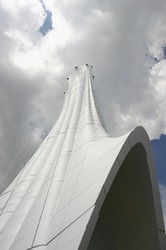 Members of the University of Michigan's architecture faculty are reaching new heights -- literally. Periscope, the 45-foot structure created by full-time faculty member Wes McGee, director of the fabrication laboratory at the Taubman College of Architecture and Urban Planning at the University of Michigan and co-founder of Matter of Design Studio with Brandon Clifford, won the 10UP! National Architecture Competition recently held in Atlanta, Ga. The tower is built almost entirely from recyclable expanded polystyrene, which was cut into approximately 500 unique blocks on the FABLab's robotic hotwire cutting system. Once assembled, the tower is post compressed with a cable network. McGee, who has an industrial design background, explains that since the competition's guidelines were pretty open, his team wanted to take a more experimental approach. The geotechnical foam they used actually serves as infill for building roads. It's recyclable and easy to move, although it took up a surprising amount of space, he adds. "It's actually pretty strong for its weight," he says. "There was foam everywhere in the lab." After he and Clifford developed the concept in April, they didn't hear whether or not their idea had been accepted. They found out with only two weeks to spare, which meant nearly round-the-clock work. "Luckily, classes finished here right at the end of April," he says. They built pieces of the structure, which was then shipped to Atlanta, and assembled it there. McGee says they drew their inspiration for the hollow structure from the look of fabric stretched to make a tent, and knew they wanted to use the lab's robotic cutting tool even before they came up with a design. The proposed projects needed to cost less than $5,000 to create and assemble, in addition to being able to be assembled on site within 24 hours. McGee is interested in entering another competition like this in the future. "We keep a running list of these kinds of competitions," he says. "I don't know if we will build a 45-foot tower, but we are looking at using foam." Source: Wes McGee, faculty member and director of the fabrication laboratory at the Taubman College of Architecture and Urban Planning at the University of Michigan, and co-founder of Matter of Design Studio Writer: Kristin Lukowski