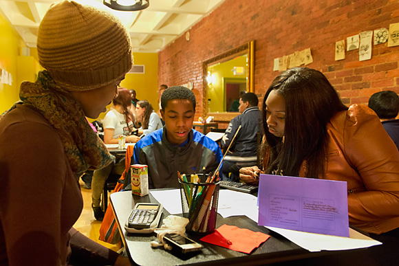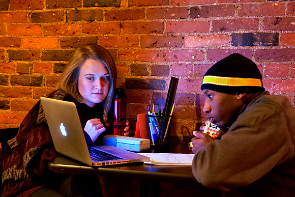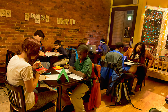 Uhle and her colleagues began plotting an evening tutoring program for Ypsilanti in a location with close proximity to bus routes. They found the perfect site in Beezy’s cafe, situated just off Michigan Avenue’s main drag and only open until 4pm daily. Beezy’s owner Bee Roll, who hosts an annual charity brunch for 826’s Mittenfest concert, says she “immediately” said yes when Uhle approached her about using the cafe space after hours.