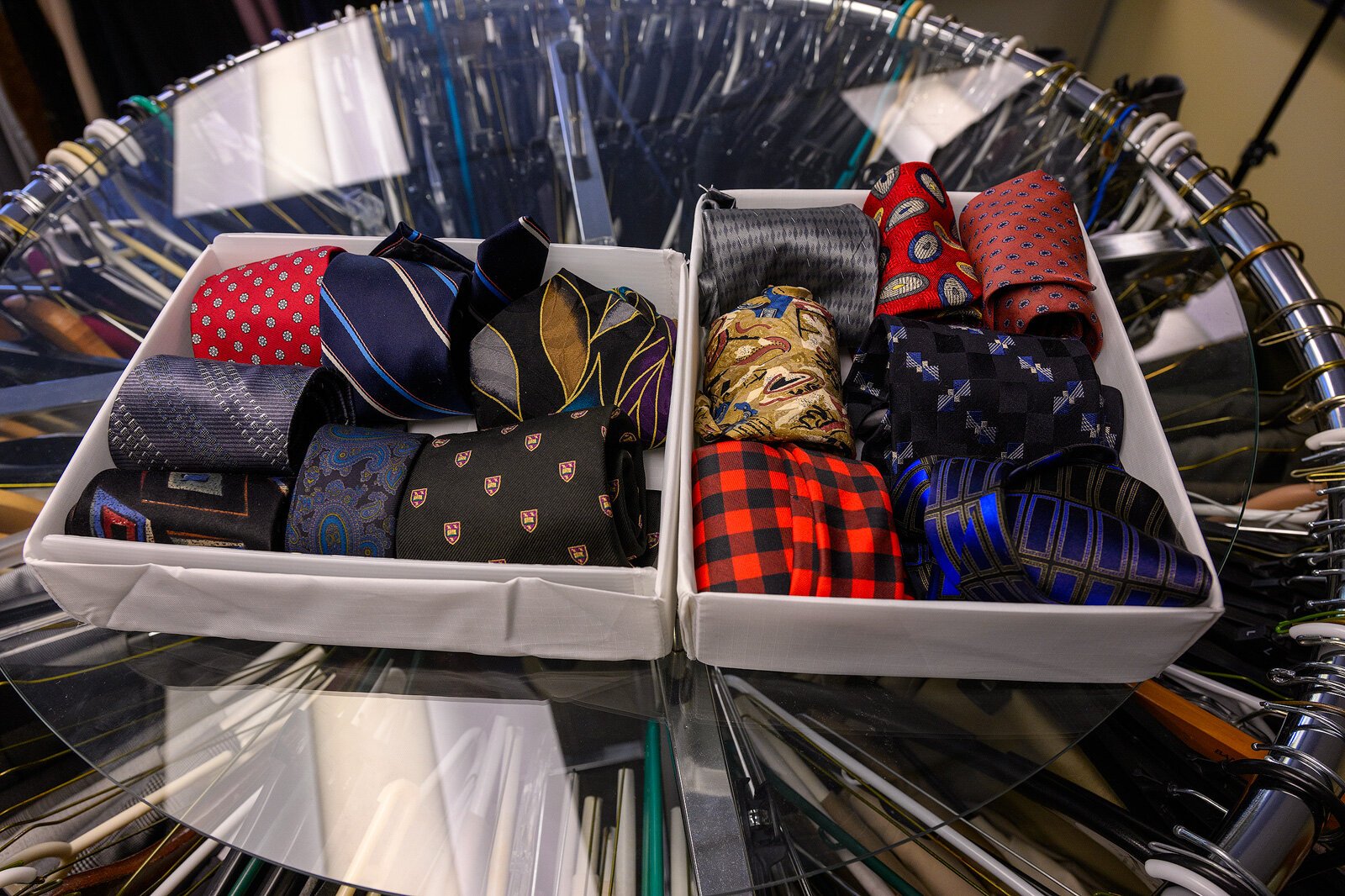 Students are invited to take an entire outfit, or about four pieces, once per semester. That not only includes pants, skirts, jackets, and tops but also shoes and accessories like ties and handbags. A private, gender-neutral dressing room is available a few doors down the hall.
