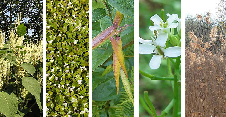 Invasive Species in top image, from left to right: Japanese knotweed, European frog-bit, Black swallow-wort, Garlic mustard, Phragmites. Photos via Creative Commons.