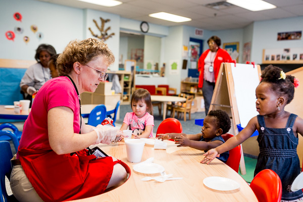 Early Head Start staff provides trauma-sensitive support to parents, too. “If mom is stressed out, so is her two-year-old, and it shows. For the parent who comes in the door and says she was late because they got evicted, well being on time is not on the priority list in that case,” Smith says. “We are lucky enough to have services through Starfish, and a lot of parent support we can hook them up with.”