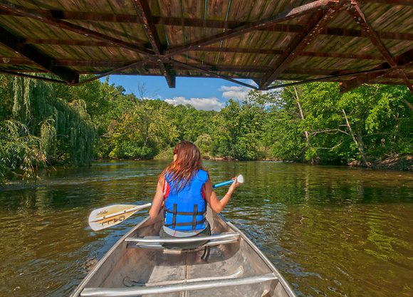 Enroute we’re getting the water’s eye view of Ann Arbor from Argo Park to Gallup Park. The 3.7-mile, $22 trip in our rental canoe is shorter this summer, as we’re first shuttled past the closed Argo Dam portage to a temporary launch downriver at Riverside Park. A bypass channel with a graduated series of drop pools to lower paddlers the 13 feet from Argo Pond to the Huron is under construction. It will replace the portage, a historic barrier for those unable to ferry their boats over the Argo Dam.