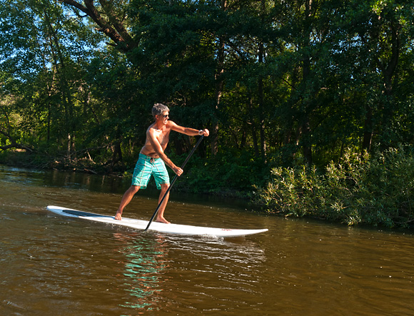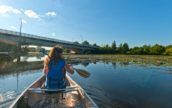 Swimmers bullet off the bridge near the Argo livery and there’s a flock of summer campers at the picnic tables, but once we’re underway on this August afternoon, only two canoes and one kayak pass by. Maybe so few because it’s Tuesday? Or maybe because we’re sweating up our life vests? A very fit and tan paddleboarder laps us three times in the heat.
