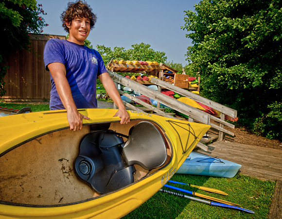 Santiago Castillo prepping a kayak at the Gallup Park Canoe Livery