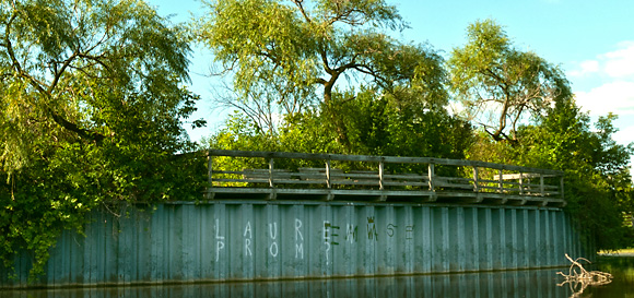“Lauren Prom?” blares the graffiti on a Huron River bridge in Ann Arbor. Is this a plea for a dance with a mermaid? Or the waterside version of proposals ribboned from a Goodyear blimp? Don’t know, but certainly the leisure of a canoe bench in the hot p.m. affords time for pondering intent as we glide by other, less lovey, calls to eat boogers and pray. Besides the spray-on missives, it doesn’t feel much like Doug and I are tripping the urban stream fantastic. But how the current flows…