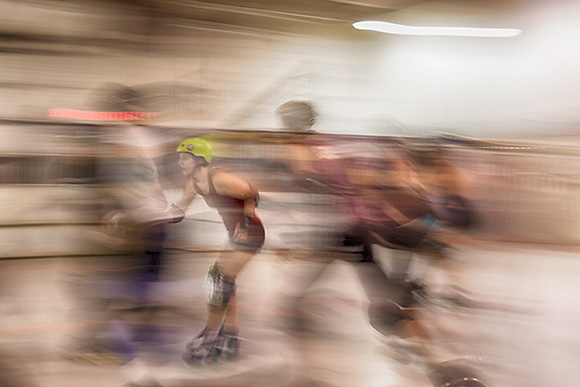 Roberts is better known to Ann Arbor derby enthusiasts by the more colorful name of Michelle O’Bomb Ya. She’s one of the many formidable members of our local derby league, the Ann Arbor Derby Dimes. Comically threatening aliases and showy outfits are common to the predominantly female sport, but the game itself is all rough-and-tumble strategy. In a roller derby match (known as a “jam”), teams rollerskate around a track at high speed, attempting to physically block the opposition from lapping them to score points.