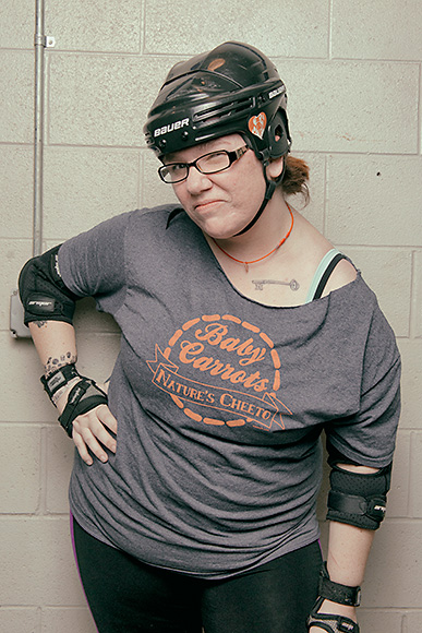 “Roller derby has come out of this weird amalgamation of third wave feminism and the riot grrrl movement,” says Derby Dimes teammate Hakuna Manslaughta. “There’s been a lot of debate about being professional about the game versus having your funny name and your fishnets. It’s reached a point where we’re very serious about the game but we still have fun names.”