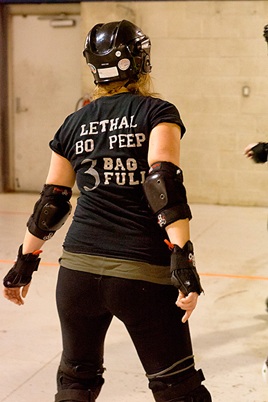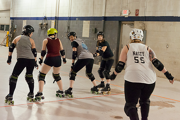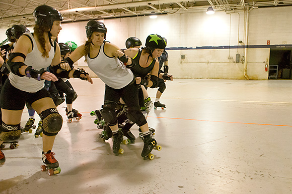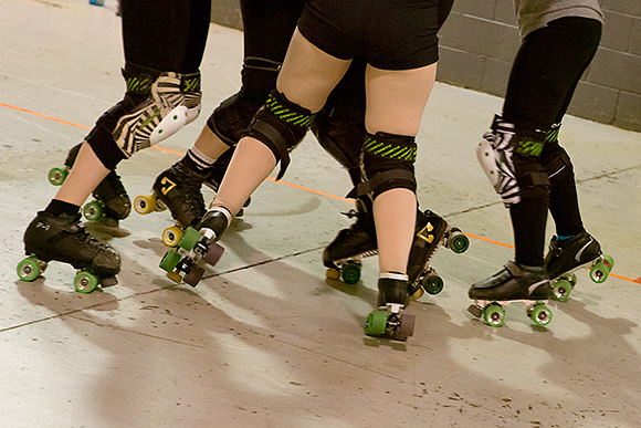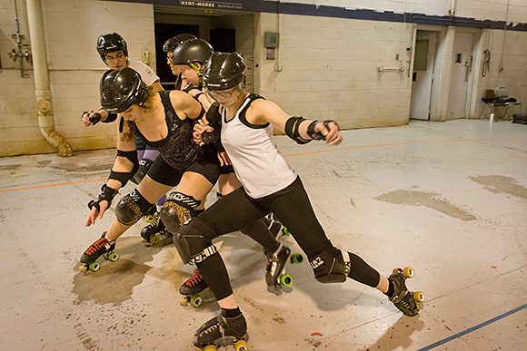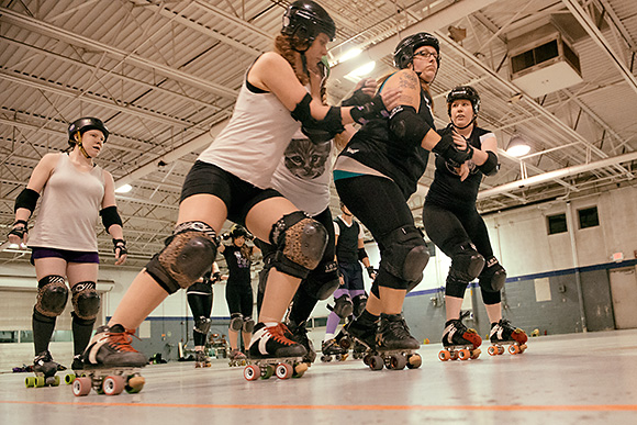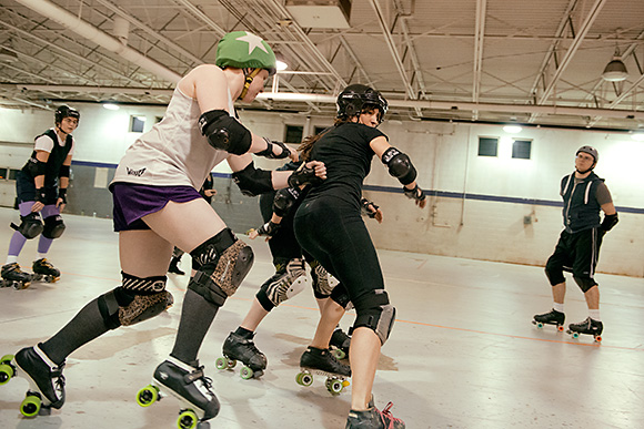 Foldenauer says the Dimes’ gameplay is consistently improving, thanks to considerable discipline across the board. New players, known as “Fresh Meat,” are required to train for about four months and pass a skills test before they join the Vigilantes. All players must attend at least two two-hour practices per week, and “off-skate” conditioning is encouraged. And while the sport can get rough, everyone is required to play by the regulations laid down by the Women’s Flat Track Derby Association, derby’s national organizing body, which accepted the Dimes as an affiliate in 2012.