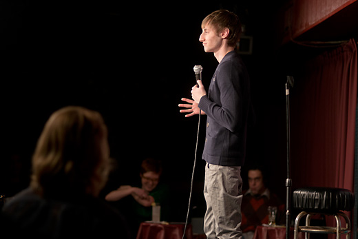 An hour before open mic night at the Ann Arbor Comedy Showcase, a pair of aspiring stand-up comedians huddle in the dark at the only two tables not illuminated in the club. The volume of their conversation occasionally overcomes a thumping funk track playing in the empty club.
