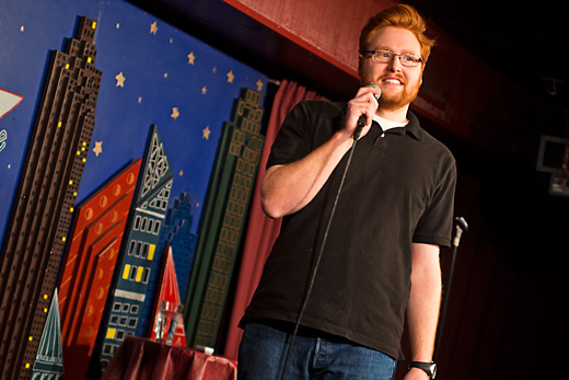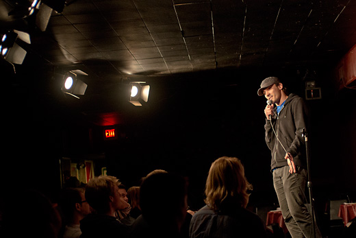 One after another the comics hit the stage for their five minutes, a red light signaling one minute left, a flashing red light signaling get the hell off the stage. Bits cover everything from Chia Pets to suicide, McDonald’s to five full minutes on hunting. The comics are nervous, congenial, cocky, apologetic.