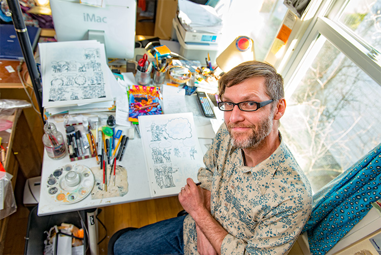 “I personally think it’s incumbent upon cartoonists to be more outgoing and learn public speaking,” he says. “Do presentations, do school visits, get out to lecture circuit to help promote your work and engage with your audience.”