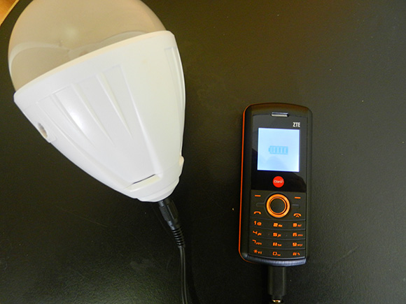 courtesy Appropriate Technology Collective – The Solar Serenity solar light charging a cell phone