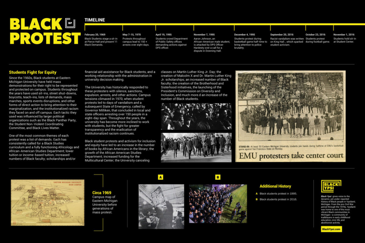 Jermaine Dickerson serves as graphic designer for the project. While he has lived in Ypsilanti since 2009, he says he wanted to make sure his designs reflected lifelong city residents’ desires and aesthetics. He worked closely with historian Matt Siegfried to gather historical data and use community feedback to inform his creative choices. Dickerson says his goal was to create “an Afrocentric aesthetic that reflected the bold nature of the project.”