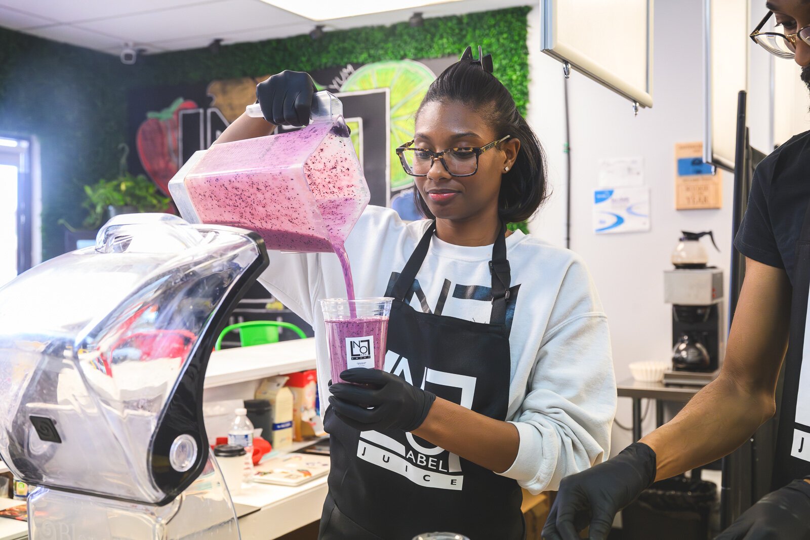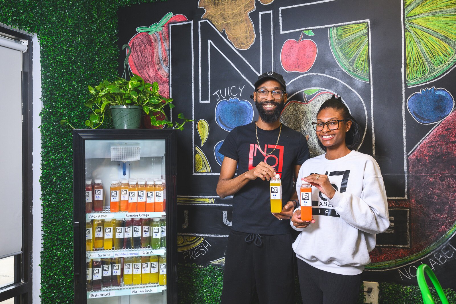 “The business started off called ‘Just Fresh Juice,’” explains Frye. “We came up with [the name] ‘No Label’ later because our bottles didn’t have labels on them, and that meant a little more to us because we don’t put anything with a label into our juice.”