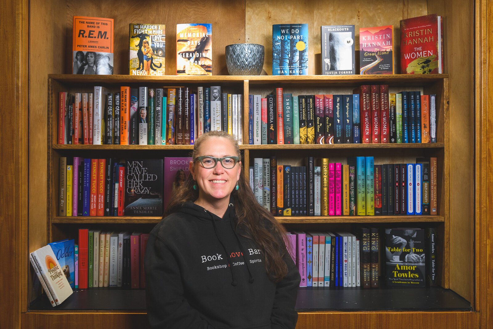 “The happiest place for me has always been the library or bookstore,” Tharp says. “I have a background in the restaurant industry, and owning a bookstore bar is my ultimate dream come true.”