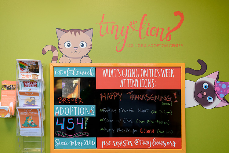 Welch says HSHV is “thrilled” with the success of both the cat cafe and cat yoga. The yoga classes are typically full or close to it, and hundreds of cats have been adopted from Tiny Lions since it opened. In fact, the HSHV is so pleased with the cats that have found homes through the cafe that Tiny Lions displays the updated adoption number on the front door each week.