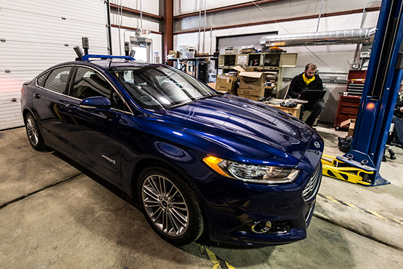 Ford, which has worked with U-M researchers on its autonomous vehicle projects, recently announced research involving the Ford Fusion Hybrid, which “builds on driver-in-control studies” using a driving simulator. Ford researchers are examining “how to merge the capabilities of human and automated drivers to create a seamless, integrated experience,” according to a December, 2013, Ford news release. “Developing the necessary infrastructure to support a sustainable transportation ecosystem will require the collaboration of many partners across multiple industries. State Farm and the University of Michigan’s robotics and automation research team are critical to creating the visionary research project.”