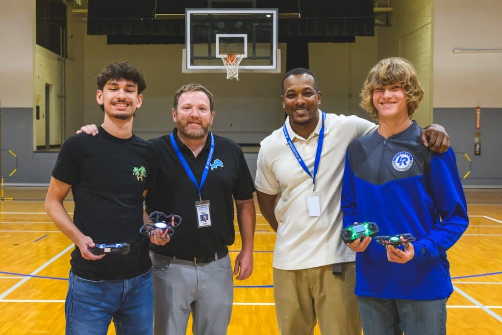 Student Wendell Turner, instructors Michael Cushman and Aaron Walker, and student Roy Aben pose with drones used in a new drone aviation technology pilot program at Ypsilanti Community High School and Lincoln High School. Doug Coombe
