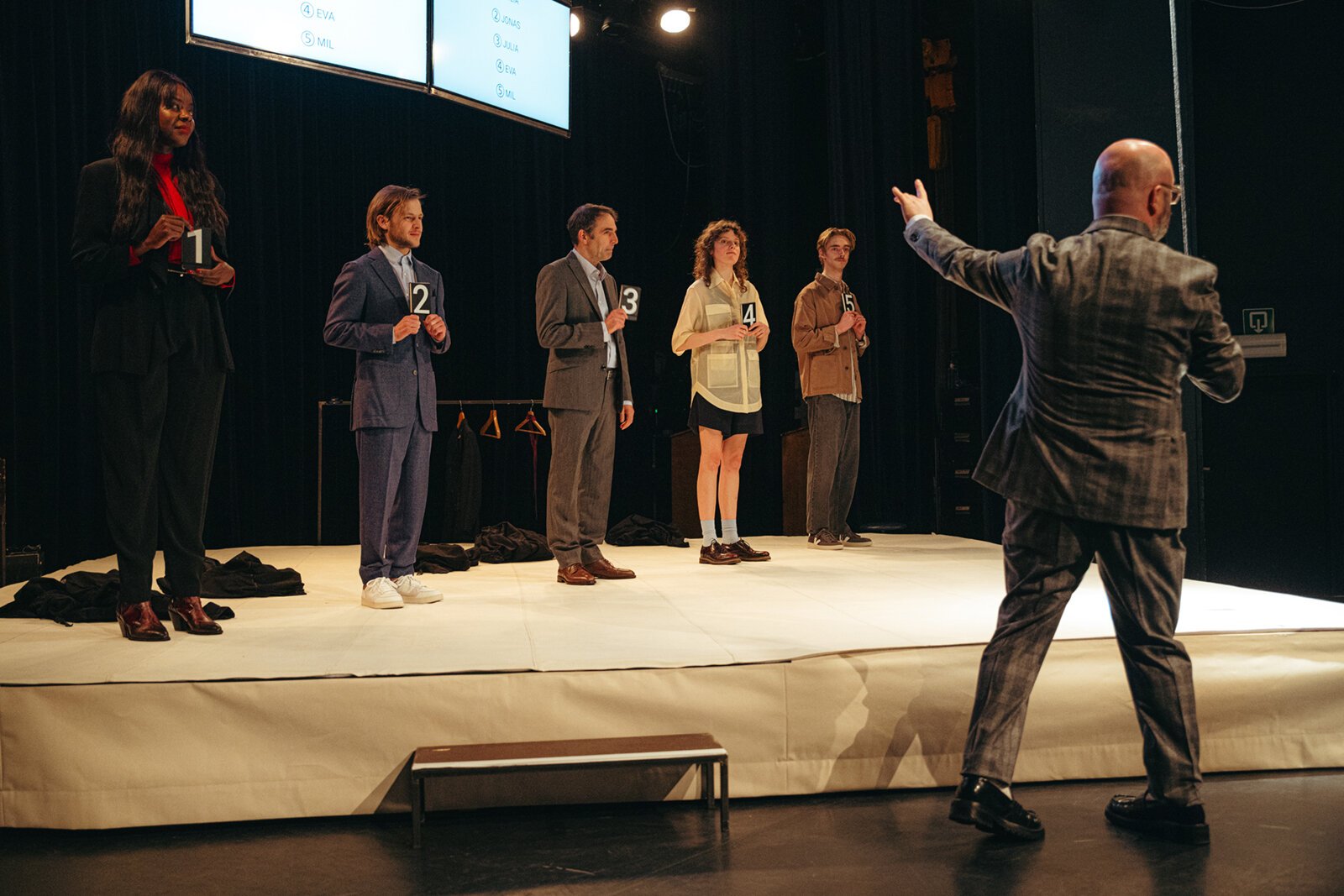 It’s almost a cliché, Devriendt says, that the idea came to him in the shower: what if you could adapt the game-show element of politics to live theater and vote actors off-stage? Each “Fight Night” audience member is therefore given a small machine and invited to cast their vote for a member of the cast. Those with the fewest votes leave the stage.