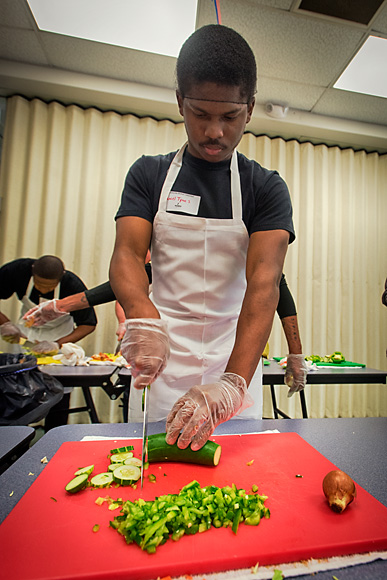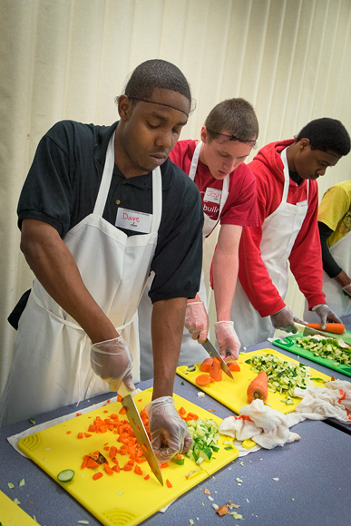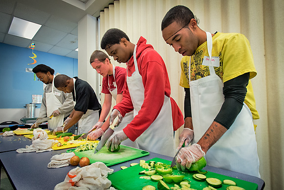 But both men found support, and a renewed sense of hope for their futures, in Food Gatherers’ Community Kitchen Job Training Program. The food bank’s free program offers six weeks of food preparation and job skills training to low-income and at-risk young people between the ages of 17 and 24. The environment is ideal for students, who have the opportunity to prepare and serve meals to the needy at Food Gatherers’ Community Kitchen in the Robert J. Delonis Center. According to Food Gatherers head of development Mary Schlitt, the program also makes an ideal fit with the organization’s mission.