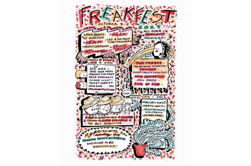 Gates has been working alongside Keelan Ferraiuolo of Ziggy’s and Austin Donnelly of Wee Wah Ypsi to bring Freak Fest to life since its first iteration in 2023. The festival has since grown from one night to three, with its lineup of both musicians and artists increasing. While most of this year’s performers hail from Ypsi, Ann Arbor, Detroit, and other southeast Michigan locales, the festival will also feature Tijuana, Mexico-based hardcore “powerviolence” punk band Hong Kong F— You. In addition to hearing a variety of local punk, metal and other alternative bands, Gates says attendees will be able to move between locations, shop vendors, and “explore downtown Ypsi in between.”