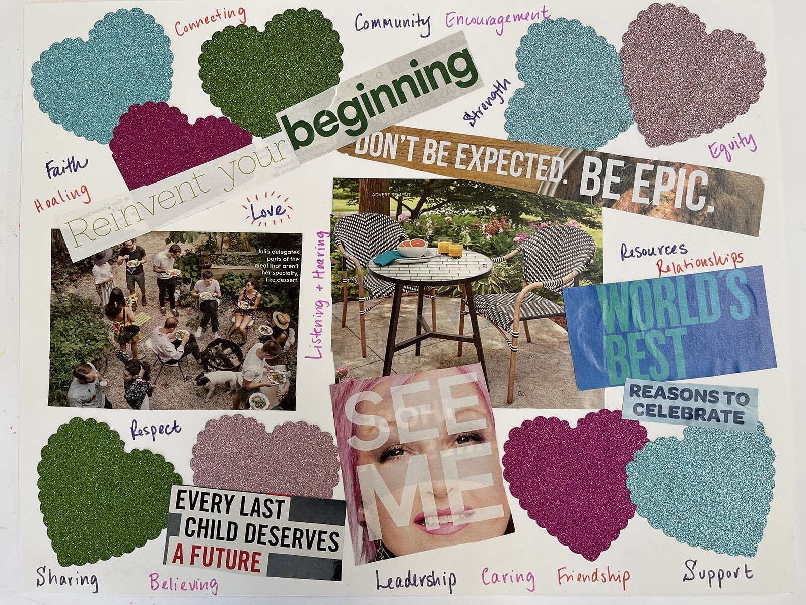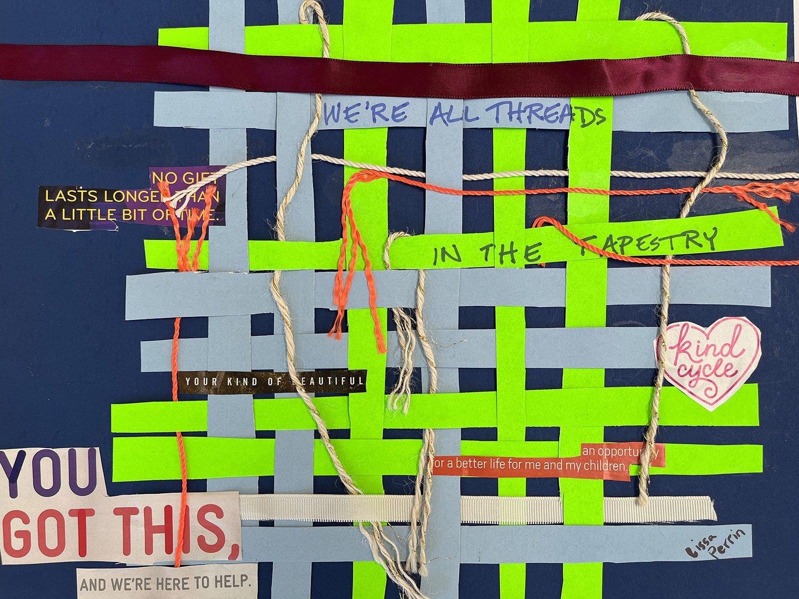“We asked them to create a piece of art that said what Friends In Deed means to them,” says Friends In Deed executive director Sarah Thornburg. “Then Mary [Thiefels] at TreeTown Murals created our mural from them. It’s not an agglomeration, but the messages those vision boards communicated inspired the design.”