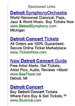 AdWords is the mechanism behind Google’s “sponsored links.” It’s the reason why, when you search for, say, “Detroit Concerts,” ads from the Detroit Symphony Orchestra, Ann Arbor’s Summer Festival and StubHub.com appear on the side of your browser window.