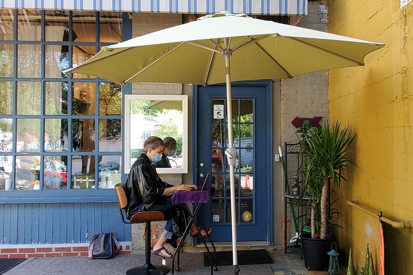 To allay their pandemic fears, Broderick installed air cleaners and only allowed one client at a time into the salon. She also established an outdoor hair salon tent with a fishing cabin-like theme, which she calls her “hair shanty,” for clients who felt safer being served outside.