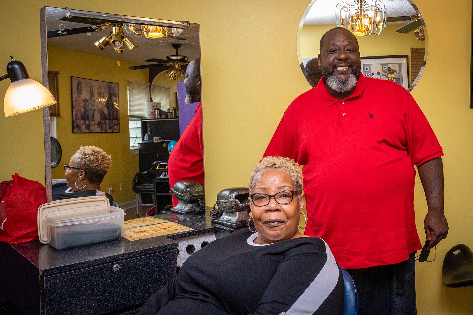 It became difficult to balance running a business with caring for her children, and she says “managing people took away my passion for doing hair.” Now, she sees about four or five long-term clients per day in her home. She’s joined in her shop by her son Maurice Mobley, who also became a certified hairdresser. He first became involved in the family business by shampooing customers when Meeks developed a bad back. When he realized he could make good money, he went to school to become licensed in cosmetology. Now mother and son cut clients’ hair side by side in their home salon.