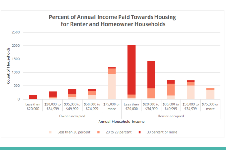 The survey found that about half of all households surveyed, including both homeowners and renters, are “cost-burdened,” meaning they spend more than 30% of their income on housing-related costs, including insurance and utilities. About 27% of owner-occupied households are cost-burdened, while 59% of renter-occupied households are cost-burdened.