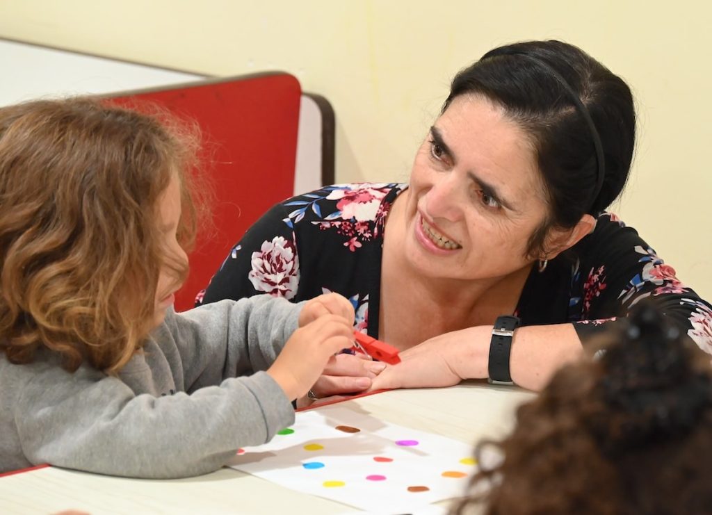 Medicaid can mean the difference between consistent preventive care and untreated health concerns that later hinder learning. Pictured: Zoila Vasquez works with a preschooler at Voces La Escuelita.