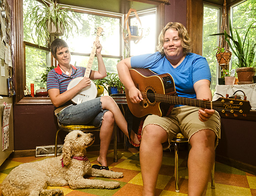 L to R : Sarah Cleaver and Kate Peterson of Nervous But Excited serenade Kate’s dog Maisy.
