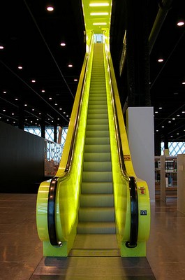 That’s not the Des Moines Central Library’s only optical illusion. The skin of the 2006 building is made of copper mesh encased in glass. The result: By day, library patrons are seemingly encased only in glass, virtually standing in broad daylight among the stacks, as well as the surrounding park. Outside, the apparently opaque copper building shimmers in the sunlight. By night, the walls become transparent from the outside, allowing passersby to view the activity inside the glowing structure.