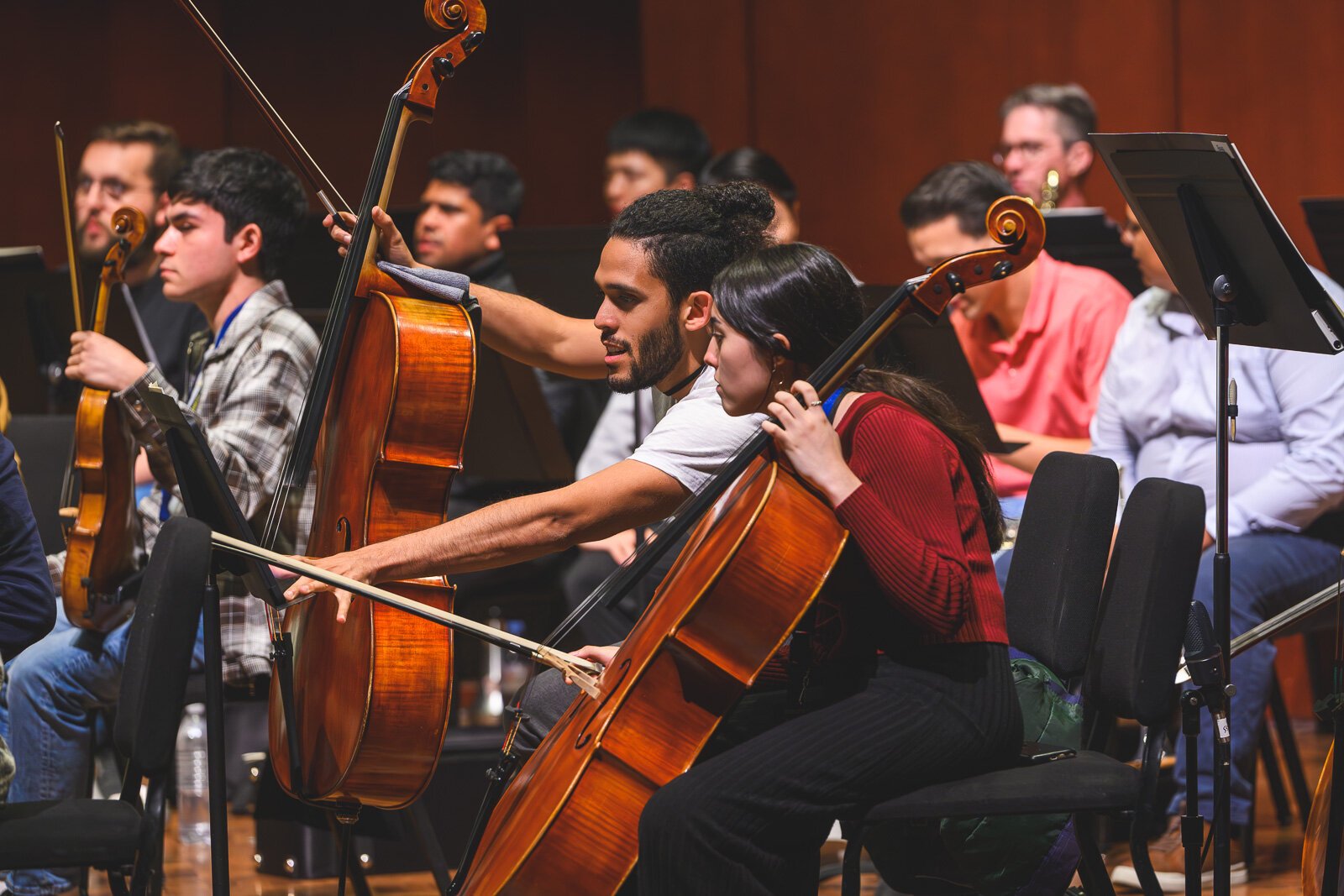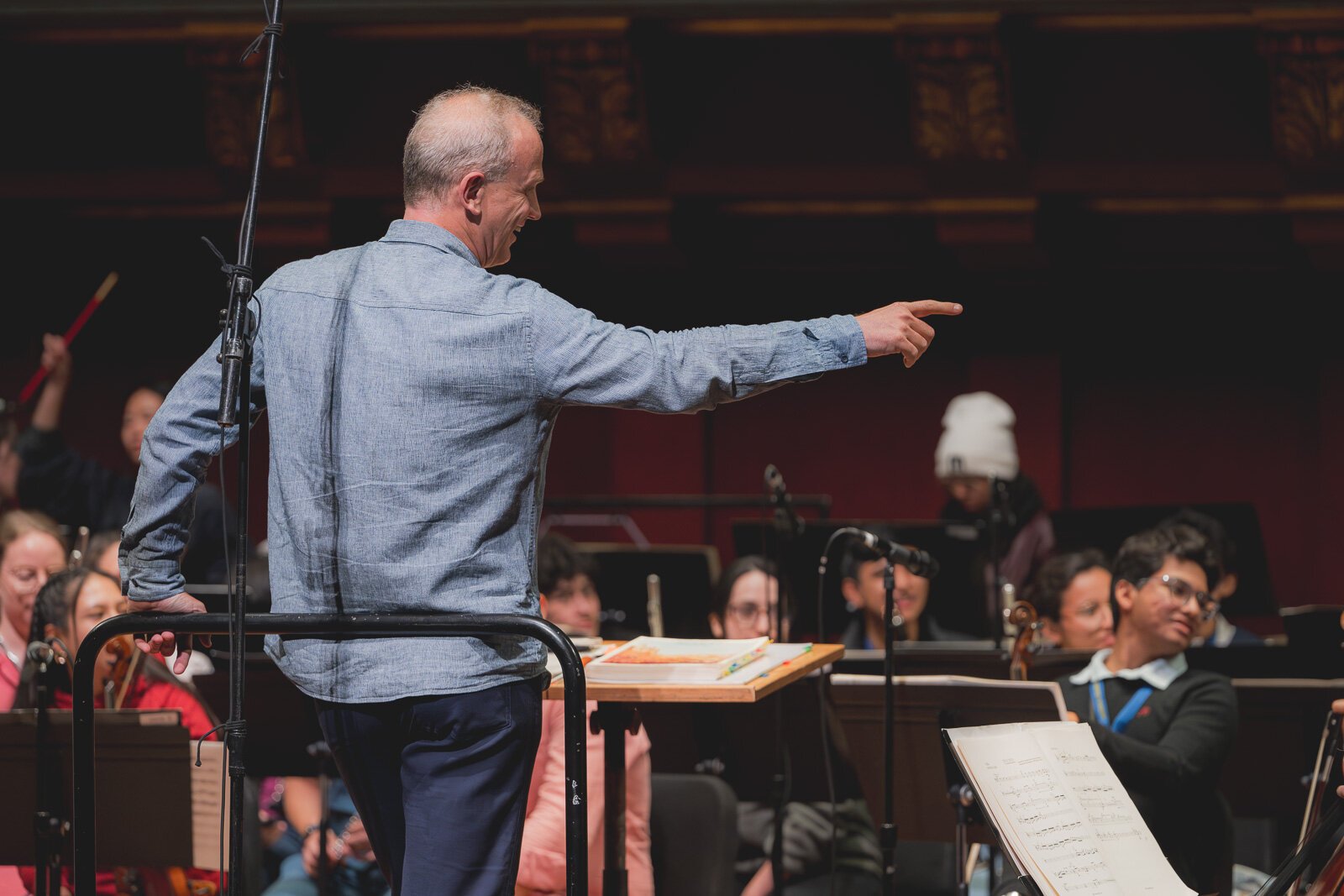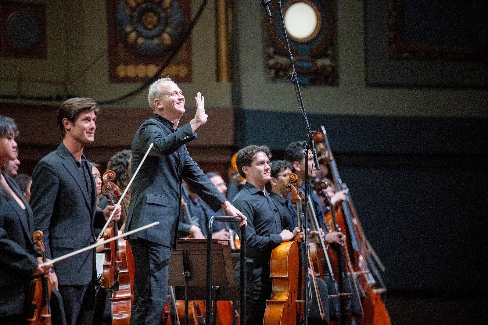 “What he just told me,” Prieto tells the orchestra, “is … when the strings have the melody, go crazy. So” – he gestures to the string section — “go crazy,” and the students respond with a few quick grins.
