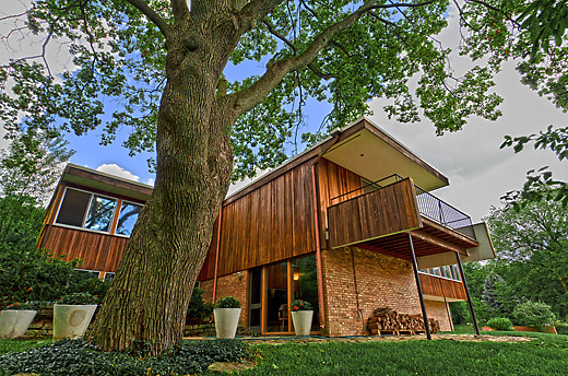 Nestled into a hillside with a large lawn and abundant trees, the two-story, flat-roofed house is meant to look and feel like an organic outgrowth of the hillside, set apart only by its clean lines and flat planes. Its wide bands of massive windows and sliding doors, vertical wood siding, and earth-toned brick foundation are characteristic of the style and of Metcalf’s work in general.