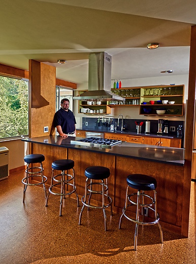 The house is oriented so that the roof’s wide eaves shade against the sun in the summer but still allow light and warmth into the second floor living areas when the sun is lower in the winter. In addition, the floor, which consists of a concrete slab that sits between steel joists and cork floors, absorbs the winter sun’s heat and warms the house. That heat supplements the furnace, which pushes hot air into the space between the basement ceiling and second floor and also heats the concrete slab, acting similar to a radiant floor system.