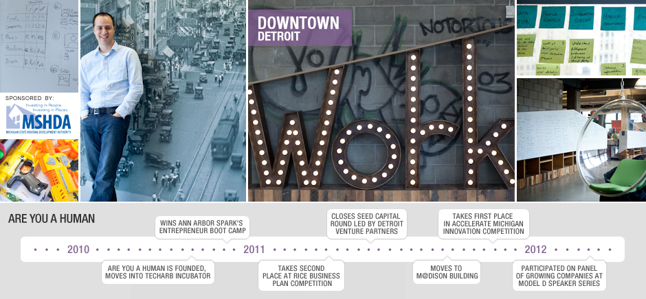 Are You a Human started as a student project in an Ann Arbor incubator before joining a cluster of innovative small businesses in downtown Detroit's suddenly thriving M@dison Building.