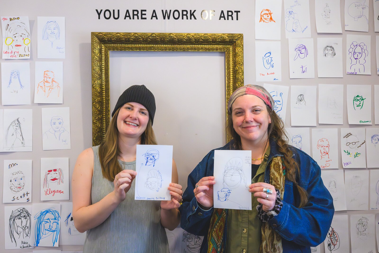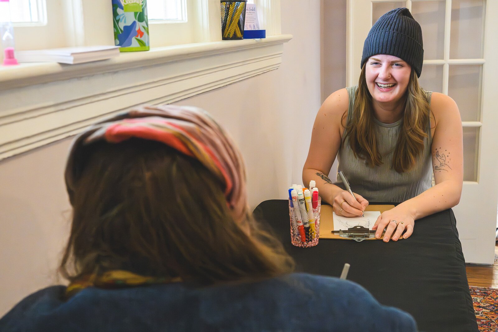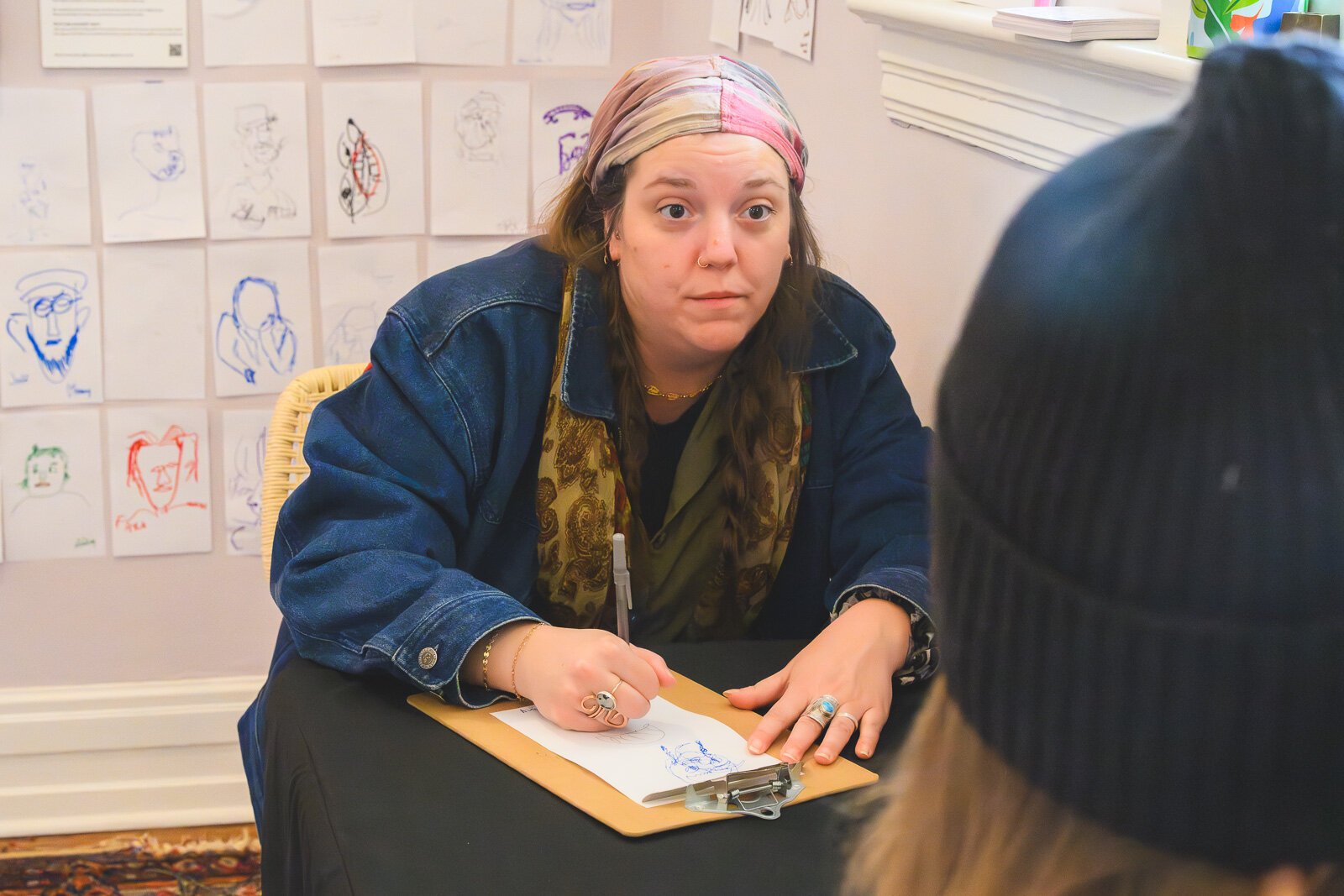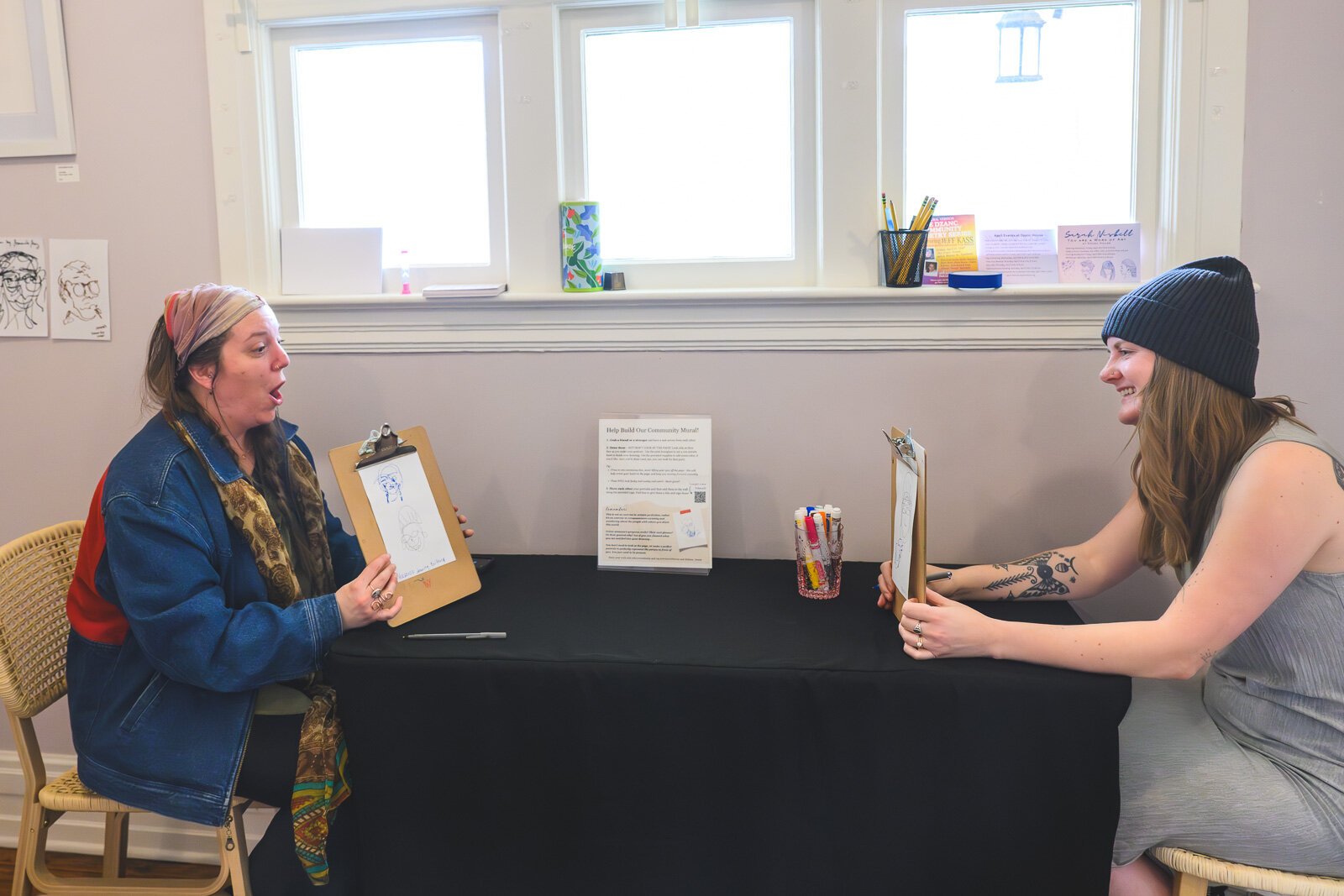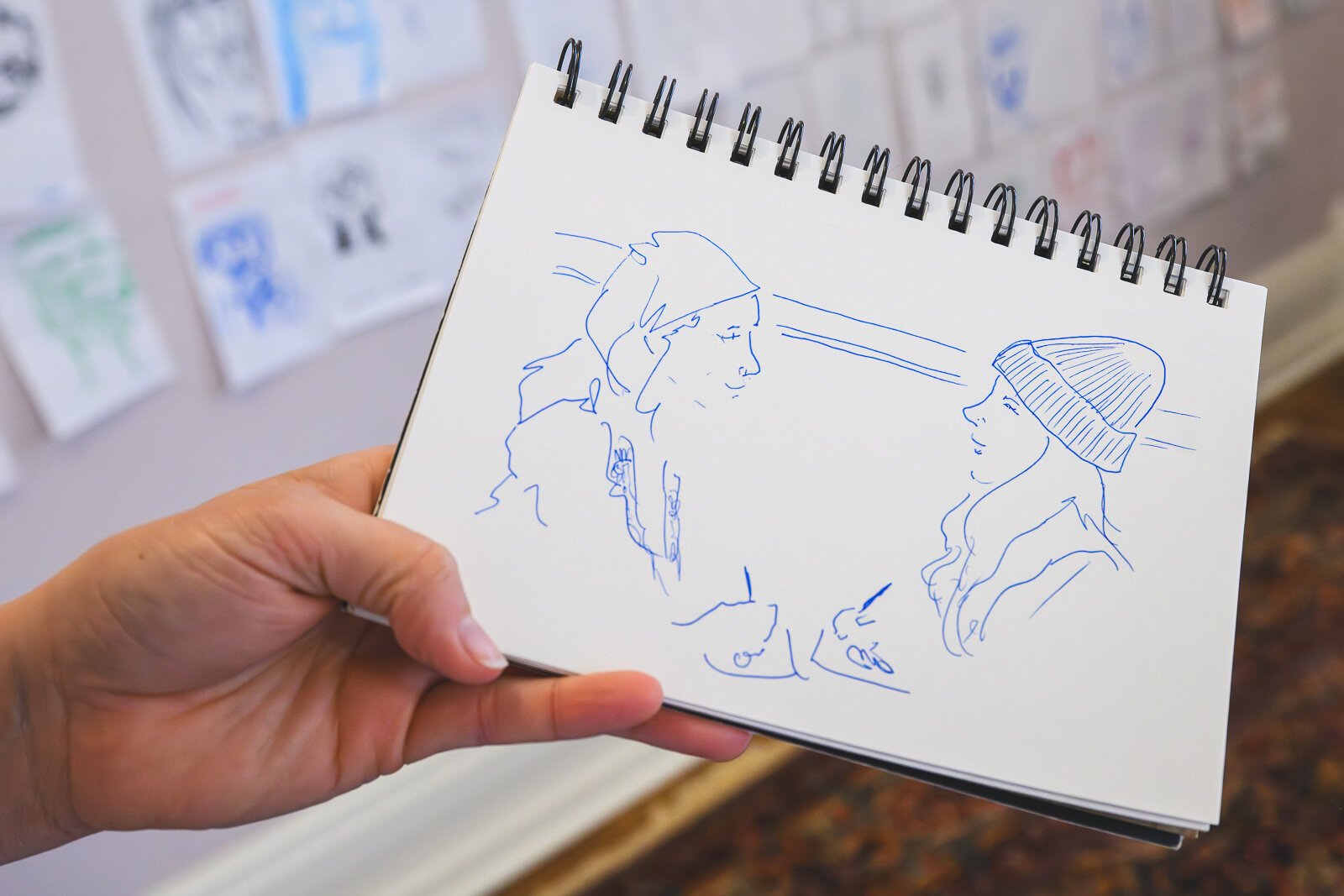 Sarah Nisbett sketching Brittany Slater and Mackenzie Stolzenburg while they draw blind portrits of each other.