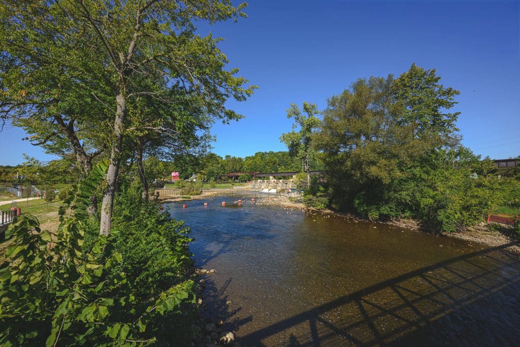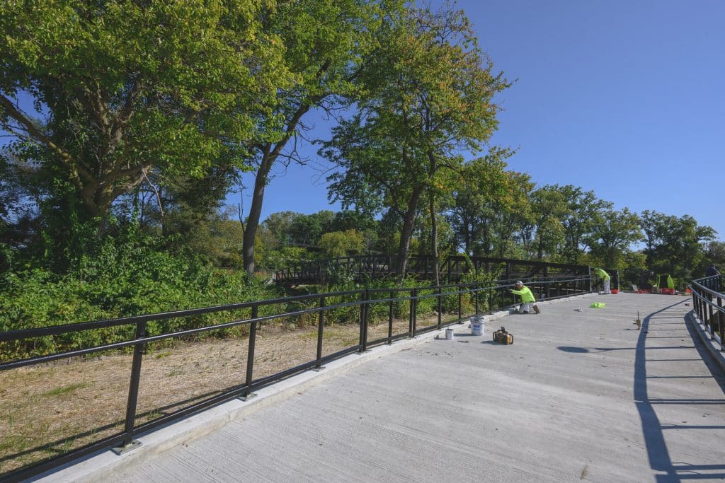 The first phase of the park’s development plan, which will be open as of this weekend, includes trails, a bridge connecting to the Washtenaw County Border-to-Border Trail, river access, and a commons for events.