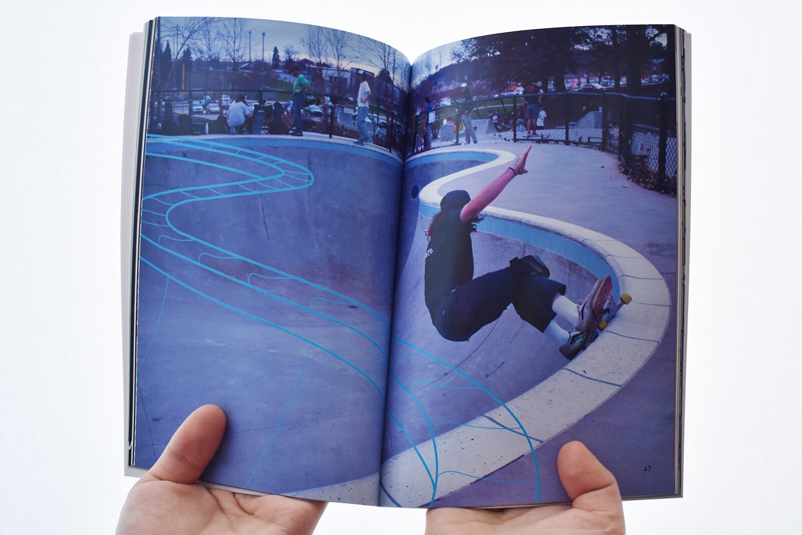 Le’s renewed interest in skateboarding led her to learn more about Ann Arbor’s skateboarding history, and to make it the focus of her senior studio project. Le researched “Skating Tree Town” by interviewing local skaters she knew, as well as those who reached out to her when she posted about the project on social media. She had the opportunity to talk to notable local skaters including Dug Song and Trevor Staples, who helped start the Ann Arbor Skatepark initiative. Le also researched by looking through old newspapers and Googling information on local skate shops.