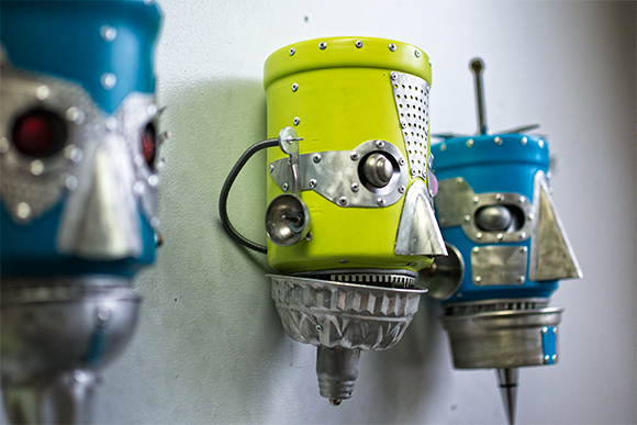 Ypsilanti Township artist Cre Fuller has maintained a studio at SPUR since it opened. Fuller says he relished the opportunity to build his popular robot sculptures in a private space at an affordable rent ($175 per month for a 12′ x 12′ studio).