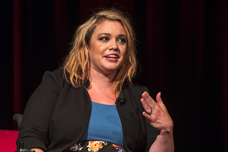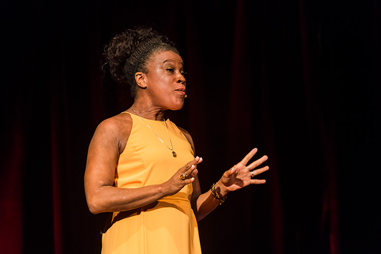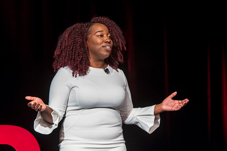 Speaker Nathalie Estiverne referred to herself as a “competitive public speaker” and a slam poet. TEDxYDL organizer Gillian Ream Gainsley says Estiverne was chosen in part to highlight the event’s partnership with Riverside and the blending of art and technology in the chosen talks.