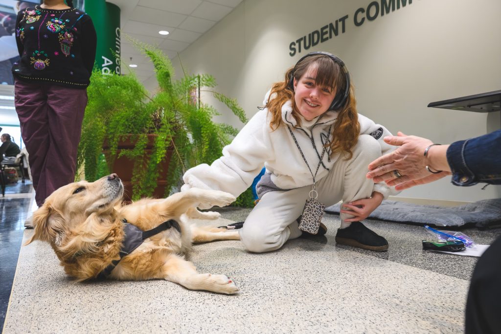 Tinker, EMU’s facilities dog, helps students reduce stress in “open paw-fice hours”