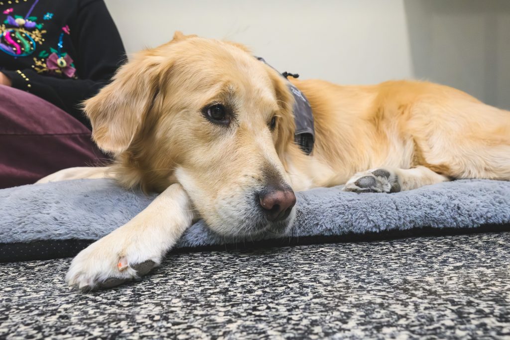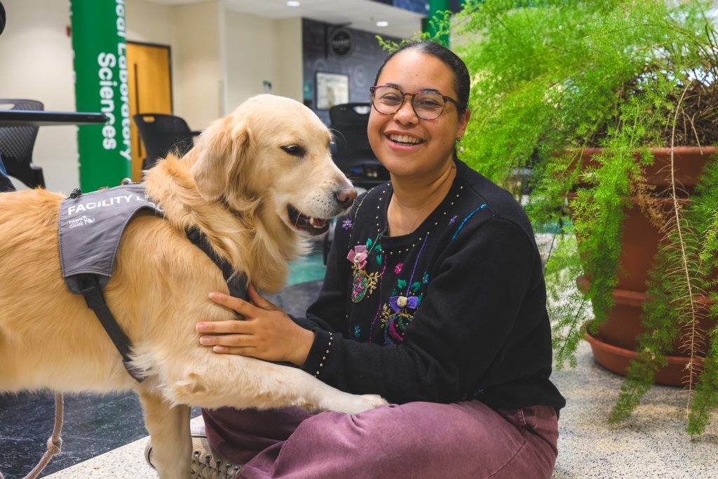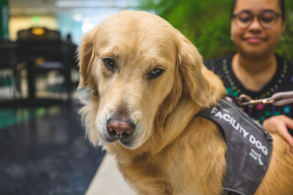 Eastern Michigan University (EMU) freshman Elena Quinonez has been missing her dog and two cats at home, so she recently stopped by “open paw-fice hours” for Tinker, the EMU facilities dog, for the first time. Quinonez says she responded to how “incredibly calm” the not-quite-4-year-old golden retriever is, even when surrounded by multiple humans in a busy student commons area.
