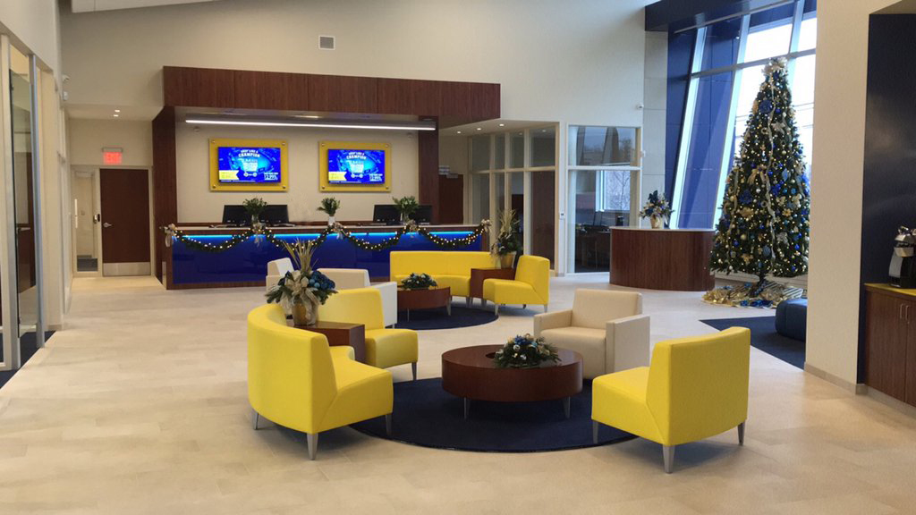 The new branch includes contemporary architecture, maize-and-blue furniture, and a mural that spans the entire wall of the community room. This mural showcases photos of the many different people, places, and objects that represent the University of Michigan and it’s clearly visible from the outside.