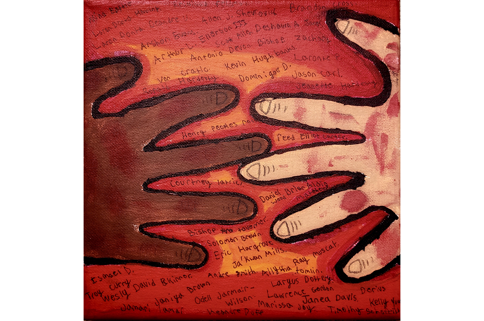 This acrylic painting called “The Hands of the Named” focuses on gun violence. The hands in the painting represent victims of gun-related deaths and the positioning of the hands is open for interpretation.The color palette of the painting is orange and red. I choose to use orange to represent a sunset because on a lot of obituaries I have seen it refer to the person’s time of death as a sunset. The names written on the background are names of victims from Ypsilanti.
