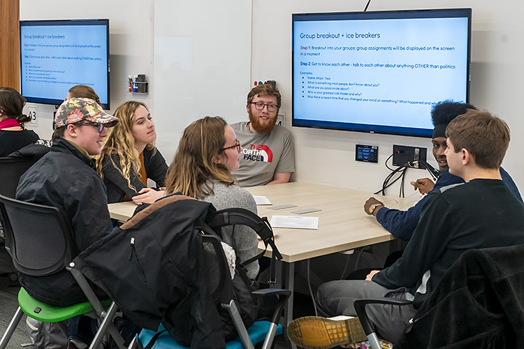 Once the presentation is completed, students are assigned small groups based on ideological information they’ve provided in a sign-up survey, so each group includes a variety of political stances. A student moderator trained by U-M’s Office of Student Conflict Resolution is also placed in each group to keep conversations flowing and fair.