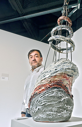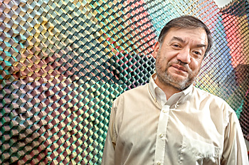 John Cantu with Susanne Stephenson’s “Winter Garden Gate” at WCC’s Gallery One